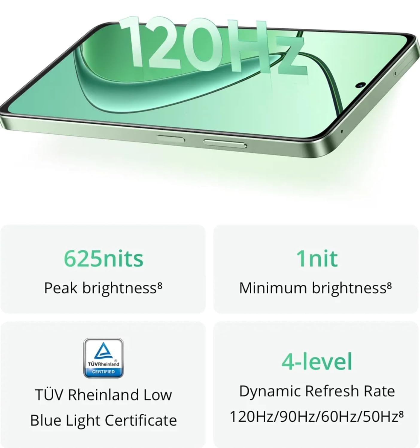 Vibrant Display The 120 Hz display on this smartphone provides smoother images for a better viewing experience. Experience smooth transitions and visually appealing performance with TUV Rheinland-certified 4-level Dynamic Refresh Rates for extra confidence.