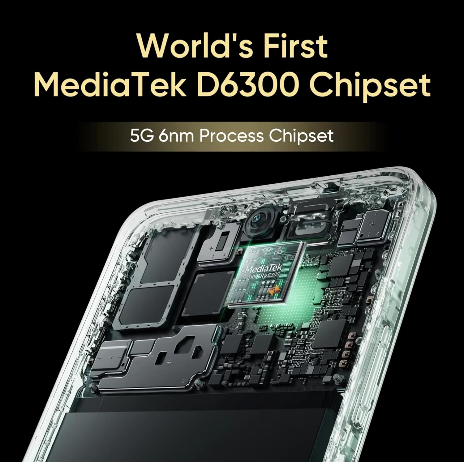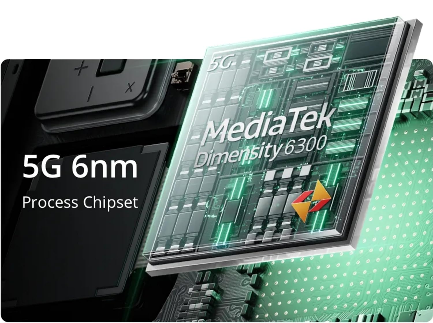 MediaTek D6300 Chipset With the MediaTek D6300 Chipset, the realme C65 5G offers unmatched efficiency and lightning-fast performance. Our state-of-the-art DAT Smart Antenna and Signal Enhancement Technologies make sure that connectivity is ideal in every situation.